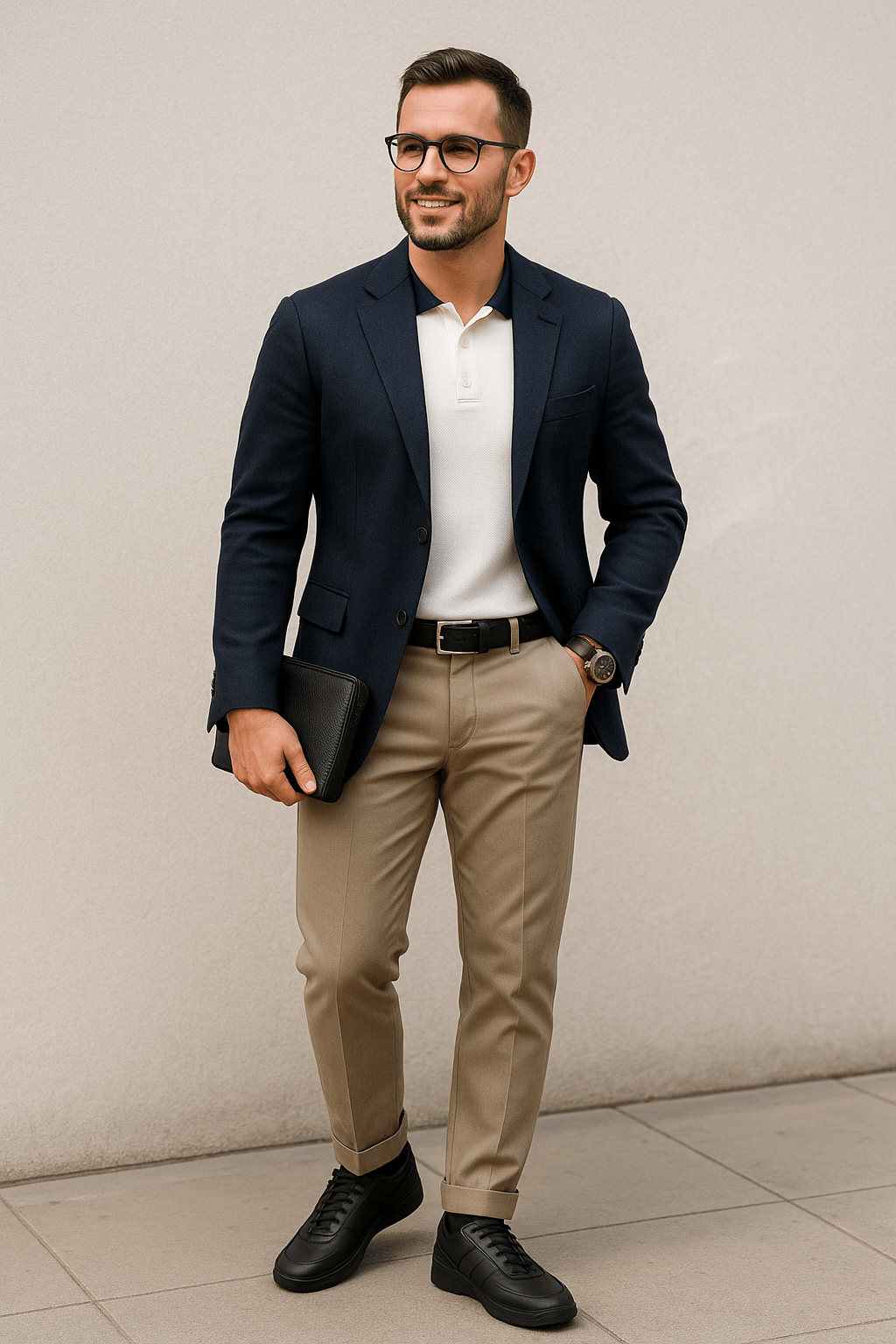 Аксессуары: Кожаный ремень в тон кроссовкам, часы Porsche Design Chrono с матовым циферблатом, мини-сумка-клатч из натуральной кожи.